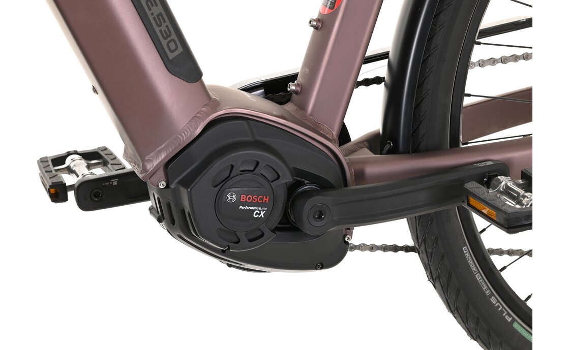 Der Antrieb des Route E.530 von Carver ist ein wahres Kraftpaket! Der Bosch Mittelmotor Performance Line CX Gen4 mit 250 Watt sowie einem Drehmoment von 85 Nm stellt das Herzstück des E-Trekkingrads dar. Mit dem leistungsstarken Bosch-Motor meisterst du mühelos auch längere Strecken und erreichst dein Ziel mit Leichtigkeit. Der Akku mit einer Kapazität von 625 Wh ermöglicht eine effiziente Nutzung und der starke Antrieb des Motors macht das Bewältigen von Steigungen zum Kinderspiel.