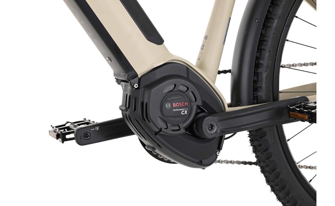 Der Antrieb vom Carver SUV E.410 ist ein wahres Powerpaket und überzeugt in jeder Hinsicht. Der Bosch Mittelmotor Performance Line CX Gen4 mit 250 Watt ist das Herzstück des SUV E-Bikes und sorgt für eine kräftige Performance mit einem Drehmoment von 85 Nm. Dank des leistungsstarken Bosch-Motors meisterst du problemlos auch längere Strecken und erreichst dein Ziel mit Leichtigkeit. Die Akkukapazität von 625 Wh garantiert dir eine effiziente Nutzung und der kräftige Antrieb des Motors lässt dich jede Steigung spielend leicht bewältigen.